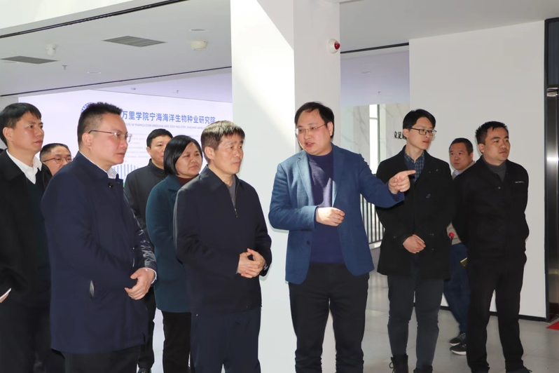 何建湘一行实地参观了宁海海洋生物种业研究院成果展示厅、师生办公学习空间,考察了水产良种创制与示范基地建设情况,深入了解了研究院的目标定位、运行模式、人才培养、发展历程等基本情况以及在水产种业科技创新工作上的新进展。