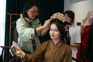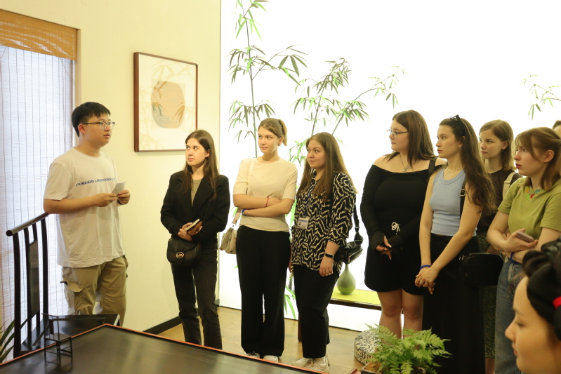 活动中,外语学院的员工们用英语流利地向俄罗斯朋友们介绍了宋朝家具的特点和设计理念。在茶艺师的指导下,俄罗斯朋友们亲自体验了点茶的乐趣,领略了中国传统服饰的魅力。“这是我第一次近距离了解中国的家具,这些家具实在太美了,中国匠人的精神让我折服,我想有机会看到更多的中国家具,了解更多的中国故事。”参观结束后,俄罗斯员工Polina激动地说道。