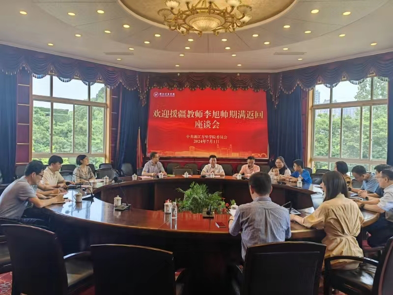 7月1日上午,学校在行政楼202会议室召开欢迎援疆教师李旭帅期满返校座谈会。党委书记王伟忠出席并讲话,党委副书记朱邦相主持座谈会。校办(党办)、宣传部、人事处(教师工作部)、工会等部门负责人,物流与电子商务学院领导班子、教师代表,李旭帅及其家属共同参加座谈会。