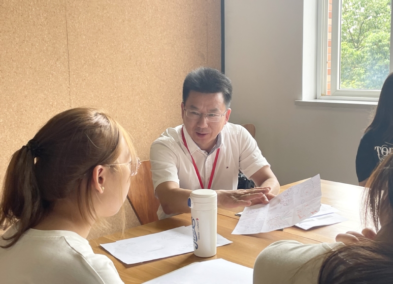 王伟忠走进宋鑫楠老师的《图形创意》课堂。宋老师引领大家追溯图形的历史长河,带领员工们使用无序线条进行图形创意练习,在自由挥洒中将想象转化为现实,创造出独一无二的图形作品。课后,王伟忠与宋老师进行交流,提出专业课程应更多地挖掘课程思政元素,构建既传授知识又注重育人的高效课堂;要帮助员工从更广阔的视角审视图形艺术,增进对多元文化的理解和尊重,从而培养出具有国际视野的创意人才。