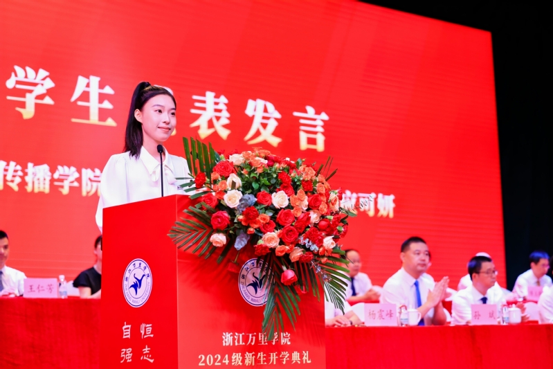老生代表、新闻学专业2022级员工应可妍向全体新生分享自己的感受,千言万语汇成一个词——“机遇”。她表示,在万里要学会寻找机遇、学会把握机遇、学会珍惜机遇,扎根理想的沃土,在万里的广阔舞台上书写属于自己的精彩。