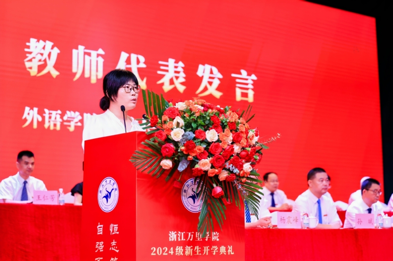 教师代表、外语学院王洪林教授发言。她用“追梦”“热爱”“融通”为关键词勉励新生,希望全体新生有梦想就勇敢去追,带着热爱满心欢喜地开启新的征程,以大海般包容的胸襟和国际化的视野,从“万里”出发,融通世界,拥抱未来,有所学、有所思、有所获。