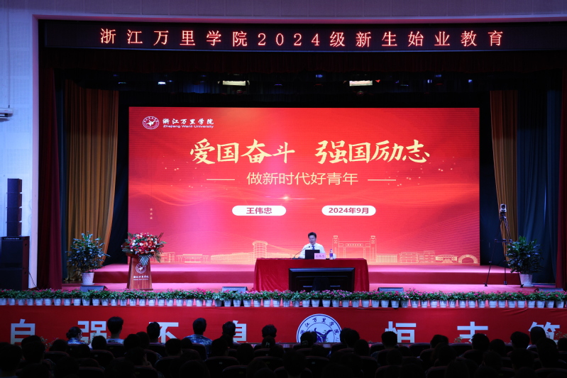 下午14:00,王伟忠在回龙校区素质拓展中心以“爱国奋斗、强国励志——做新时代好青年”为题讲授“书记第一课”。王伟忠指出,党的二十大提出新时代新征程党的使命任务,发出全面建设社会主义现代化国家、全面推进中华民族伟大复兴的动员令。党的二十届三中全会对进一步全面深化改革、推进中国式现代化作出系统性战略部署,强调要统筹推进教育科技人才体制机制一体改革。新时代青年学子正逢其时、大有可为,要有大视野、大格局、大情怀。他谆谆叮嘱全体新生,要成为实现中华民族伟大复兴的先锋力量,做有理想、敢担当、能吃苦、肯奋斗的万里好青年,为实现中华民族伟大复兴的中国梦贡献力量,为学校的事业发展添砖加瓦!